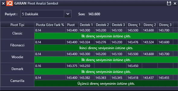 Pivot Analizi Sembol Penceresi’nde yer alan pivot tipleri, önceki periyoda ait fiyat verilerini farklı hesaplama yöntemleriyle değerlendirir. Bu nedenle her yöntem için pivot, destek ve direnç seviyeleri farklılık gösterebilir.