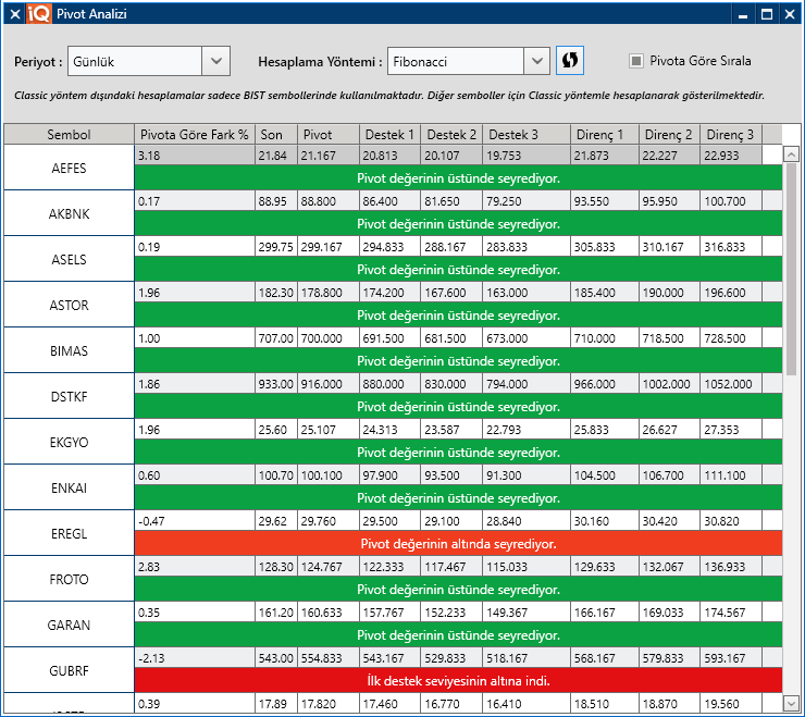 - Classic yöntem dışındaki hesaplamalar sadece BIST sembollerinde kullanılmaktadır. Diğer semboller için “Pivot Analizi Sembol” penceresinden sembol bazlı pivot analizi yapabilirsiniz.