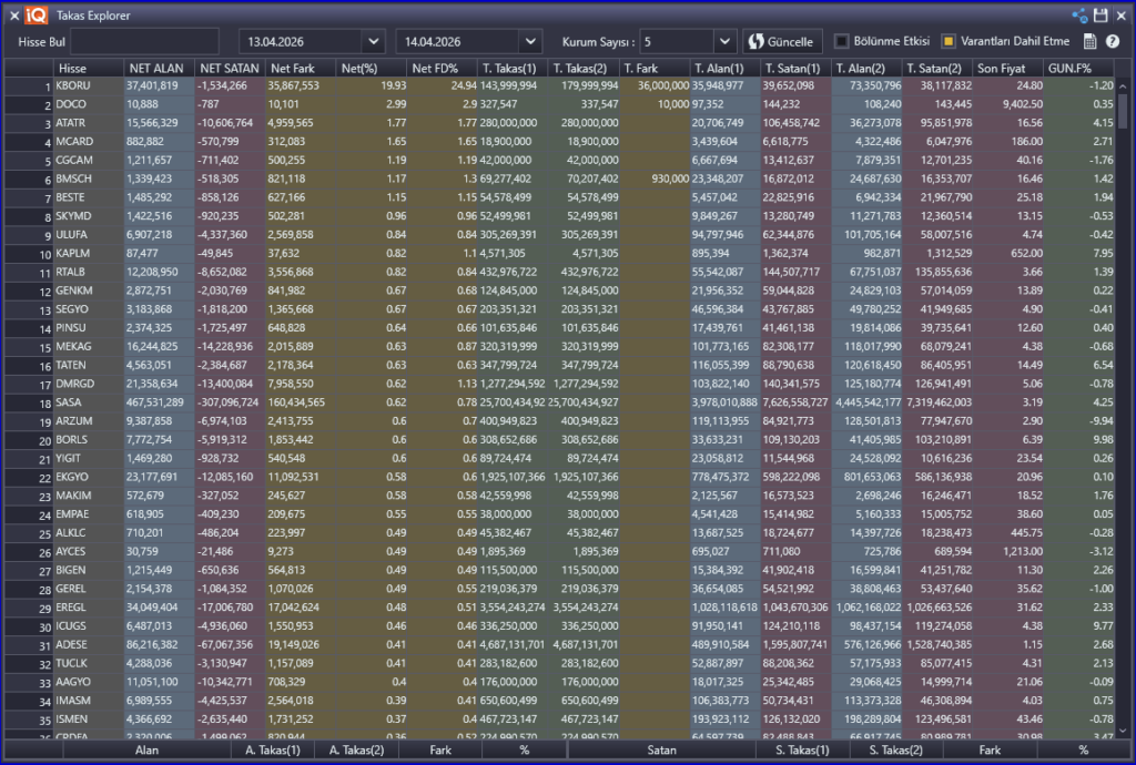 Bu analiz ile belirlediğiniz kurum sayısı için, belirlediğiniz tarih aralığında, kurumların senet bazında takas değişimlerinin, toplam takas miktarına oranını bulabilirsiniz. Net% sütununa göre sıralama yaparak pozitif ve negatif yönde ilk sıraları alan senetleri yakından takip edebilir, bir satır seçtiğinizde o senette belirlediğiniz tarihte takası en çok değişen kurumları görüntüleyebilirsiniz.