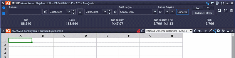 Aracı Kurum Dağılımı penceresinde bulunan Net, Toplam Lot, Net Toplam % ve Net Toplam (n kurum) alanlarını AKD_OZET fonksiyonu ile Formüllü Fiyat Penceresi’nde kullanabilirsiniz.