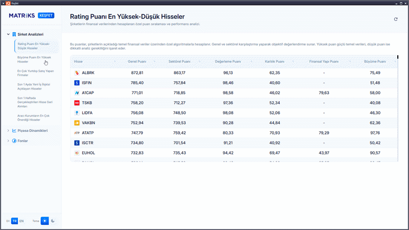Şirketlerin finansal verilerinden hesaplanan özel puanlamalar ve performans analizleri tek bir ekranda birleştirilmiştir. Rating, büyüme, karlılık ve finansal yapı gibi temel kriterlere göre puanlanan hisseleri listeleyebilir; sektörel karşılaştırmalar yaparak objektif bir değerlendirme sunan algoritma sonuçlarına hızlıca ulaşabilirsiniz. Yatırım fonlarının sektörel tercihlerini ve güncel eğilimlerini takip etmenizi sağlayan analiz ekranı bulunmaktadır.