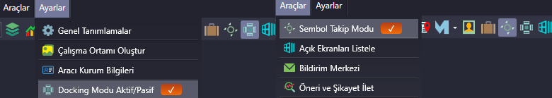 Sembol takip modu ve Dock Modu aktif edildiğinde Araçlar menüsünde aktiflik belirteci gösterilmektedir.