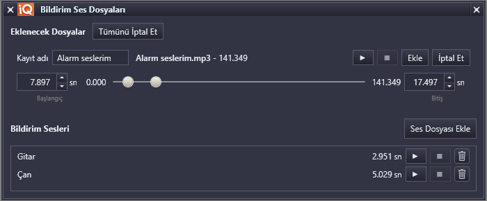 Kendi seçtiğiniz ses dosyalarını alarm olarak sisteme dahil edebilir, seslerin başlangıç ve bitiş sürelerini sizler belirleyebilirsiniz. Dahil ettiğiniz sesleri alarm oluştururken seçerek çalmasını sağlayabilirsiniz.