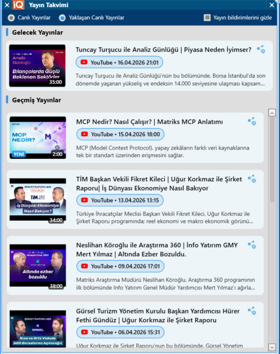 MatriksIQ’ya entegre edilen yeni Yayın Takip Sistemi ile birlikte, uygulama başlığında yer alan buton üzerinden yayınlara anlık katılım sağlama imkanı sunulmuştur. Geçmiş ve gelecek yayın listelerine uygulama üzerinden ulaşabilir, canlı yayın bildirimleri sayesinde canlı piyasa analizlerini ve önemli konuklarımızın yer aldığı yayınlarımızdan anında haberdar olabilirsiniz.