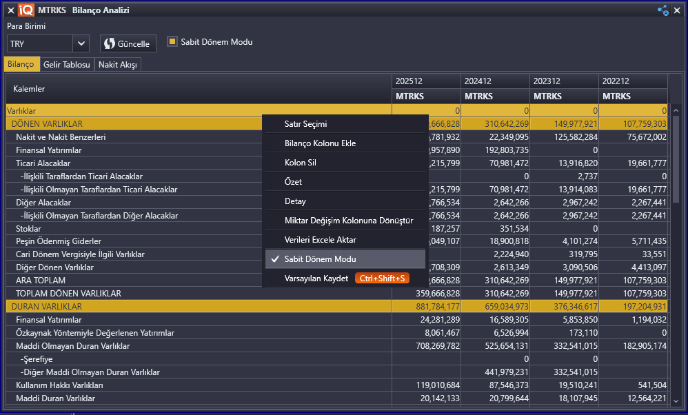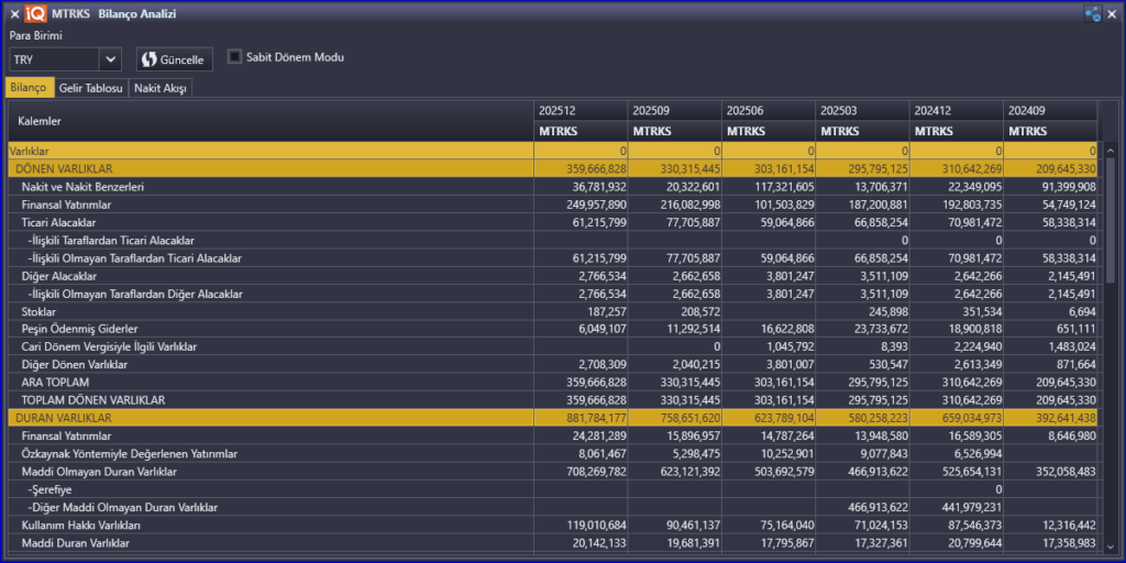 Bilanço Analizi’nde tek tip bilanço açıklayan şirketlerde tek düzlemde gösterim sağlandı. #