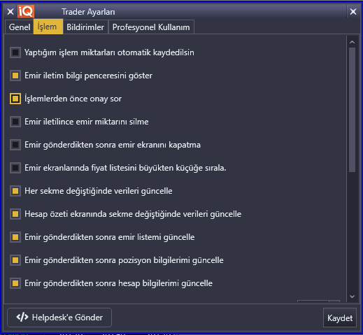 Grafikten emir gönderiminde iptal ve düzeltme işlemlerinin onay sorulmadan yapılması, Trader Ayarları > İşlem > ‘İşlemlerden önce onay sor’ seçeneğine bağlanmıştır.